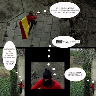 Tydzień na Smoleńsku rpzpoczoł performens . Cecylia zawiesiła na Kasztanowcu hiszpańską flage uszytą przez Justyne. Następnie Justyna jeszcze większą zamocowała na Balkonie. W końcu Kamienica należy do Hiszpana. Admininstracia przysłałą policje, a na drzewo wysłała profesjonalnego wspinacza, za zdjęcie flagi dostał dniówkę.